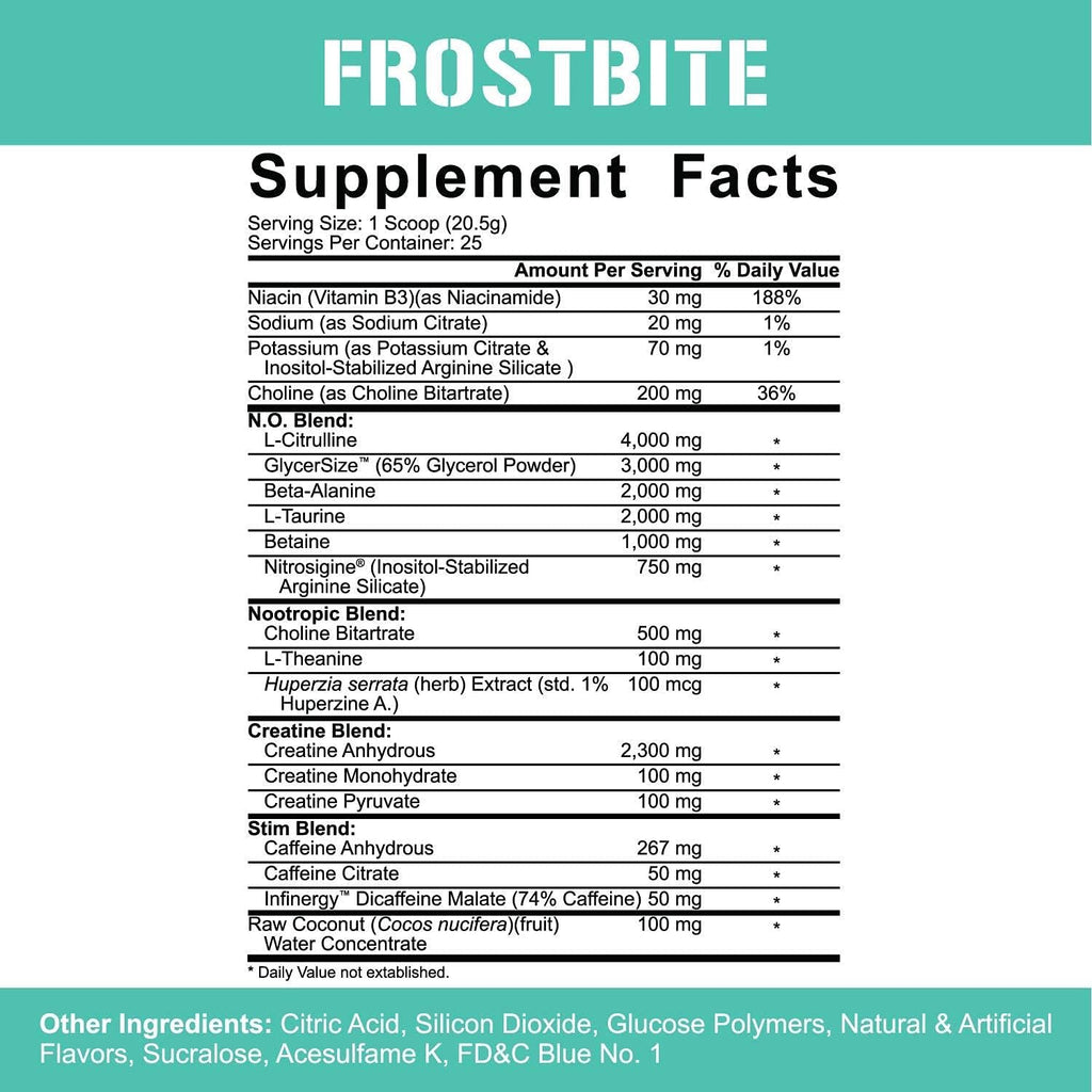 L-Citrulline, Beta-Alanine, Taurine, Agmatine Sulfate (AgmaMax™), N-Acetyl L-Tyrosine, Creatinol-O-Phosphate (COPMax™), Caffeine Anhydrous (250mg), L-Norvaline, Rhodiola Rosea (Root) Extract