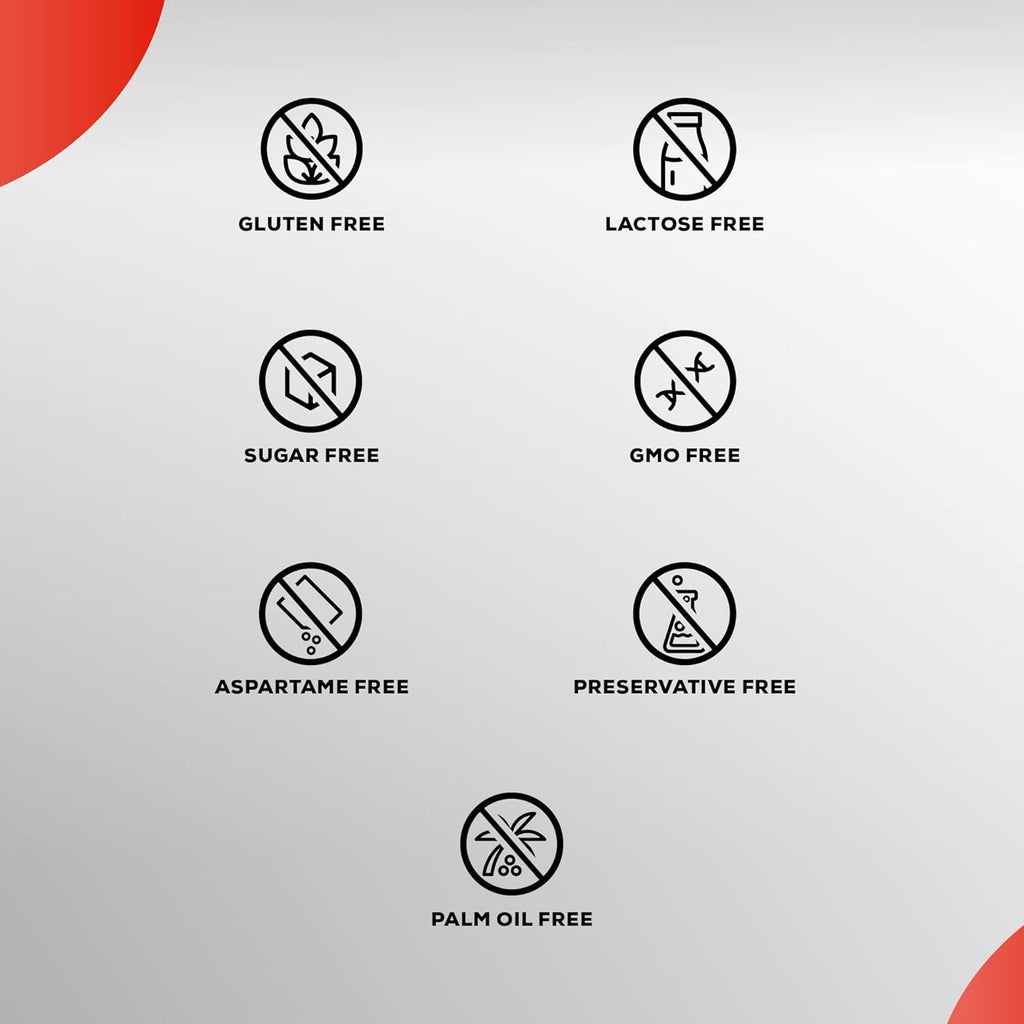 Hydrolysed beef collagen 88%, acid (citric acid), anti-caking agent (magnesium oxide), flavourings, hyaluronic acid 0.7% (contains soy), L-ascorbic acid, creamer [partly hydrogenated coconut fat, skimmed milk powder, emulsifiers (E471, E472a), glucose syrup, sucrose, milk protein, stabiliser (potassium phosphates), anti-caking agent (calcium phosphates)], sweetener (su-cralose), salt, DL-alpha-tocopheryl acetate, colours (Allura Red AC*, indigotine). Made in a plant that manufactures milk, egg, gluten, soy, crustaceans, sulphur dioxide and nuts containing foods. (*Allura Red AC: may have an adverse effect on activity and attention in children.)