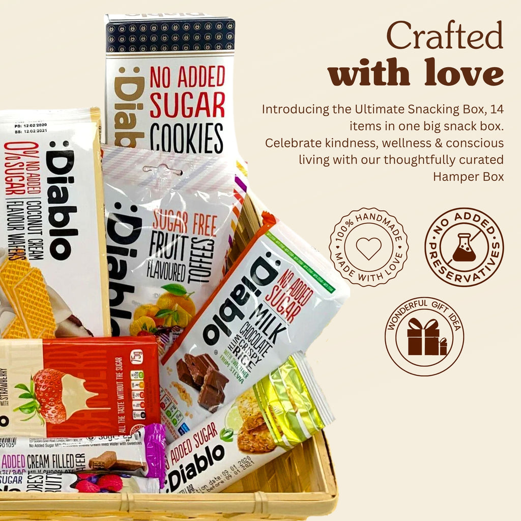 Introducing the Ultimate Diablo Sugar Free Snacking Box, 13 items in one big snack box. Each Box is packed with sugar free no added sugar snack lover.