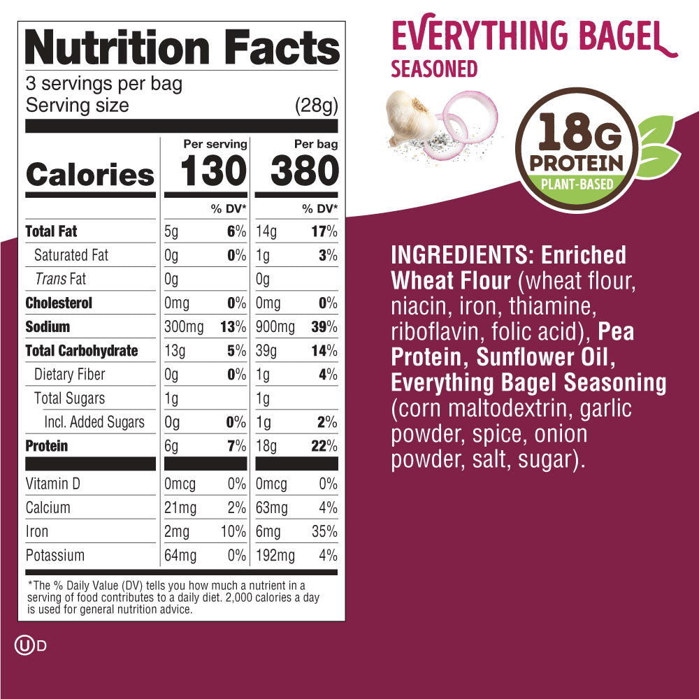 Ingredients: Enriched WHEAT Flour (WHEAT Flour, Niacin, Iron, Thiamine, Riboflavin, Folic Acid), Pea Protein, Sunflower Oil, Everything Bagel Seasoning (Corn Maltodextrin, Garlic Powder, Spice, Onion Powder, Salt, Sugar), Modified Food Starch, Malt Syrup, Sea Salt, Bakers Yeast, Natural Flavor. Manufactured in a facility that also processes: MILK and SOY.