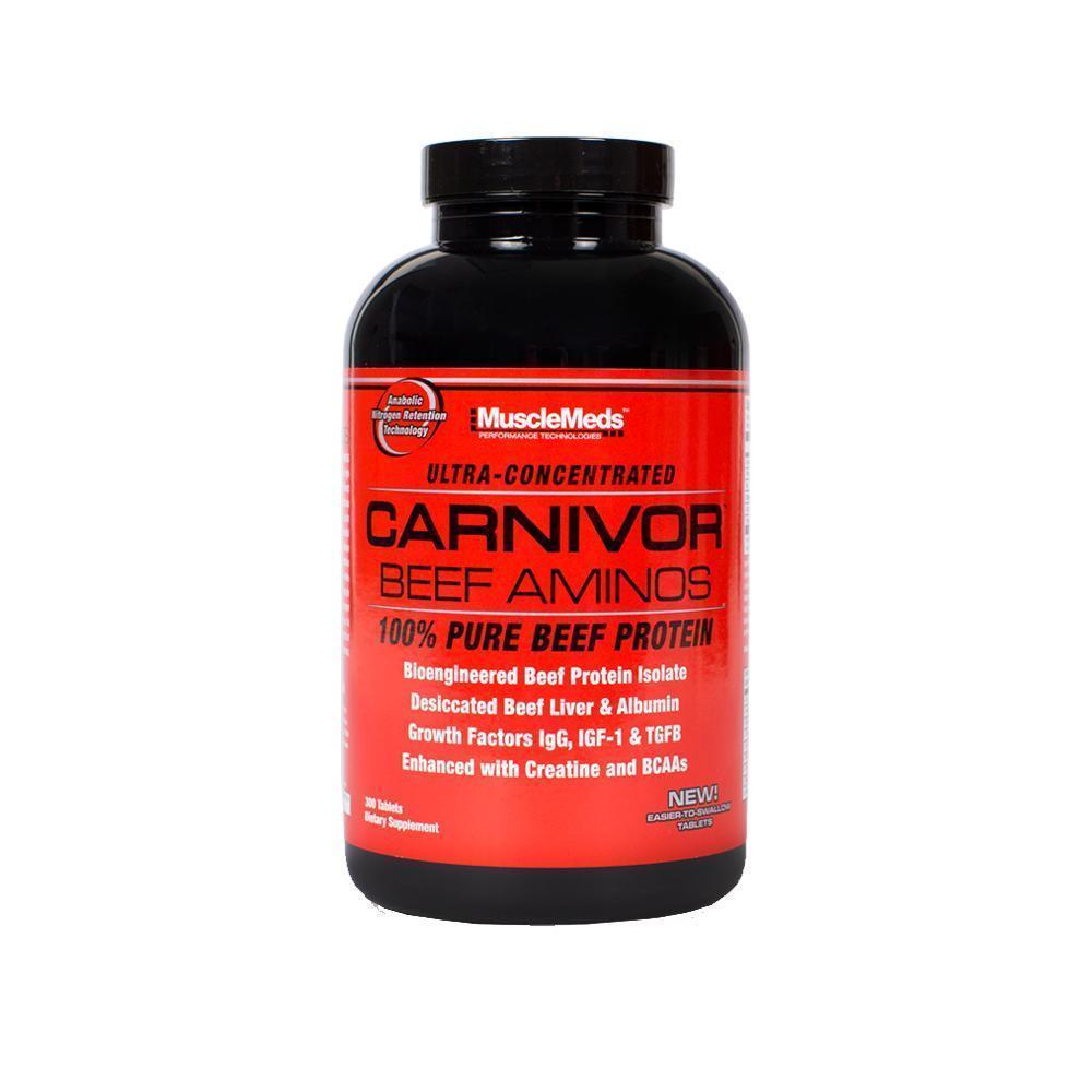 MuscleMeds Ultra-Concentrated Carnivor 100% Beef Aminos use a patented processing technology to provide high concentrations of quality amino acids. Made from the finest premium grade Beef Protein Isolate, Beef Albumin, Argentinian Desiccated Beef Liver and Beef Immunoglobulin, each ultra-concentrated tablet provides a full spectrum of essential amino acids including high levels of branched chain amino acids (BCAAs) and bio-active growth factors. Plus, the addition of creatine helps increase muscle size and strength, while added branched chain keto acids (BCKAs) help you recycle these concentrated amino acids for enhanced nitrogen retention. This powerful amino acid formula will allow you to harness the muscle building force of beef without any fat or cholesterol, and with even higher concentrations of aminos, creatine and growth factors!