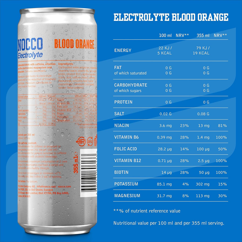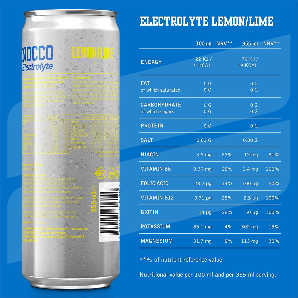 NOCCO Electrolyte Lemon/Lime is your refreshing companion for an active lifestyle. With its zesty citrus taste, this sugar free drink is ideal before, during or after physical activity – but also as a pick-me-up any time of the day. Each can contains 180mg caffeine to boost focus and alertness, plus magnesium and potassium to support normal muscle function and maintain electrolyte balance. Enriched with B vitamins (B6, B12, niacin and folic acid), it helps reduce tiredness and fatigue. Lightly carbonated, crisp and invigorating – the perfect choice for energy and hydration.
