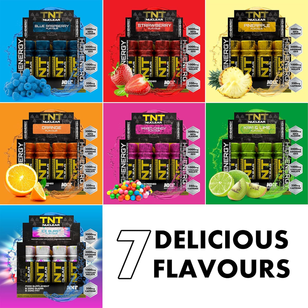 TNT Nuclear Shots are a high intensity pre-training formula that is designed to give the user exactly what is needed before intense training session; muscle power, and high energy. TNT Nuclear Shots come in Orange and Kiwi Lime flavours made with caffeine, amino acids and vitamins.
