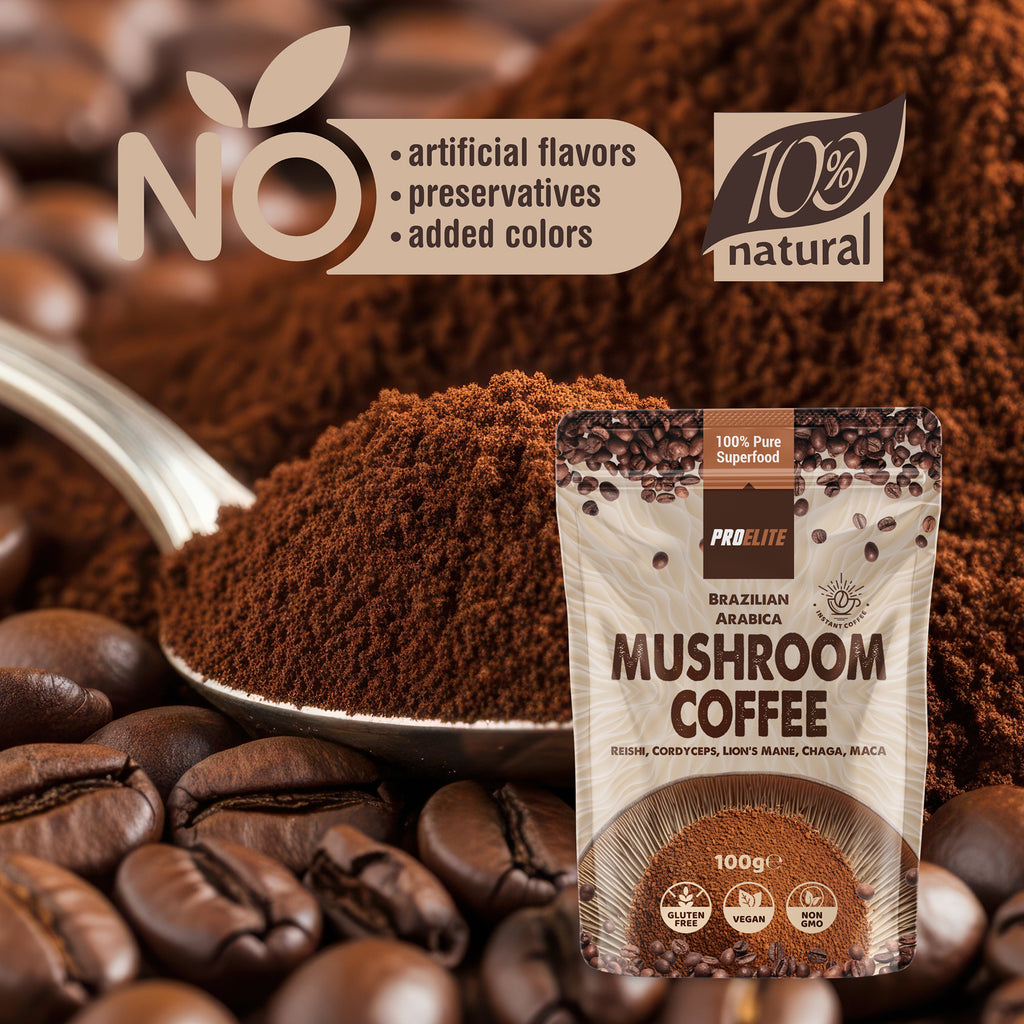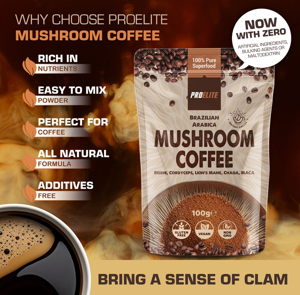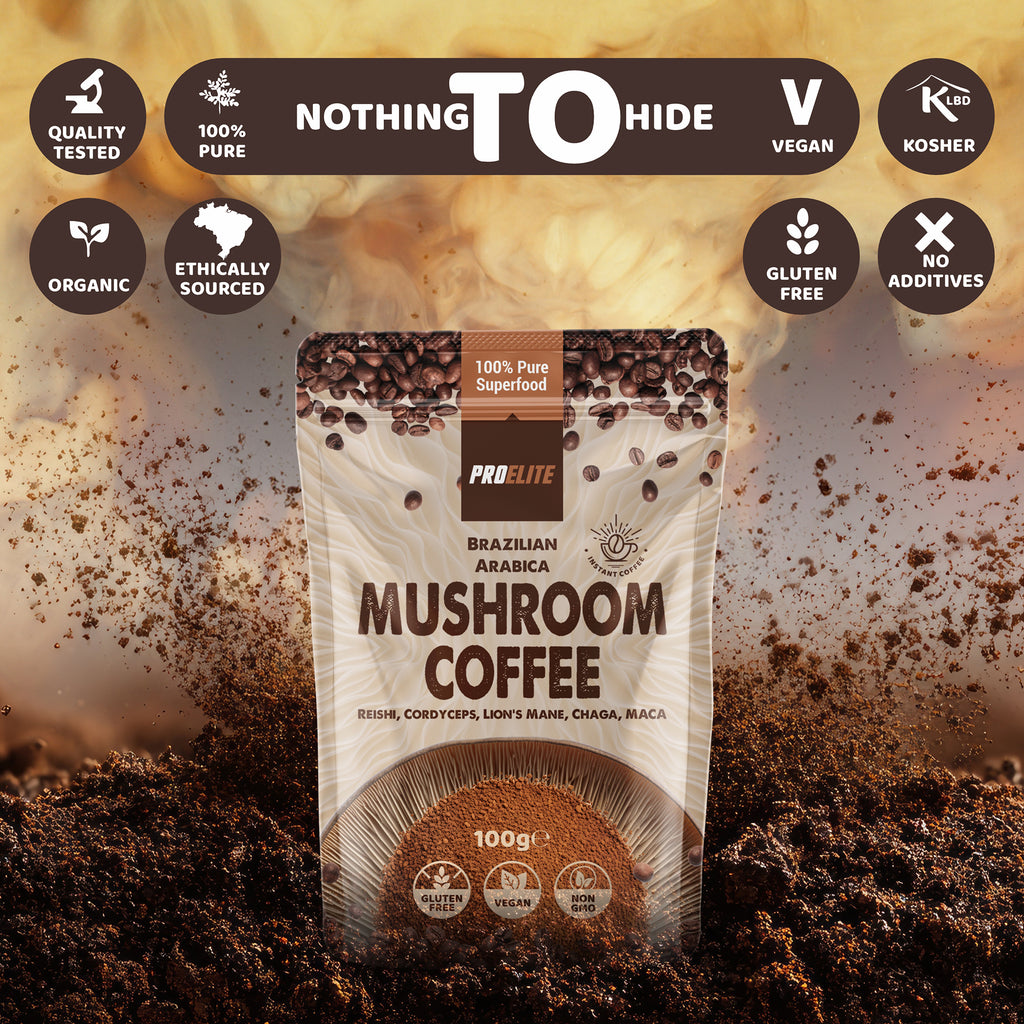 100% Brazilian Arabica Instant Coffee, Organic Mushroom Blend: Chaga, Lion’s Mane, Reishi, and Cordyceps. Organic Maca Powder, Organic Ashwagandha Powder