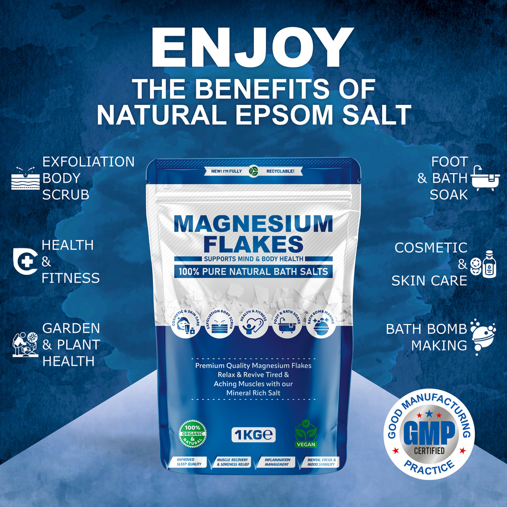 Add salts to a warm bath (37-39°C is ideal). Relax and soak for at least 20 minutes. To help maintain general wellbeing, use around 100-250g (1/2-1 cup) 1-3 times per week, If you don't bathe as regularly, then you may prefer to have a more intense transdermal magnesium bath with 500g-1Kg (2-4 cups) once a week. You can use alongside other bath salts, oils and foams, so any bath can be boosted with Magnesium flakes.