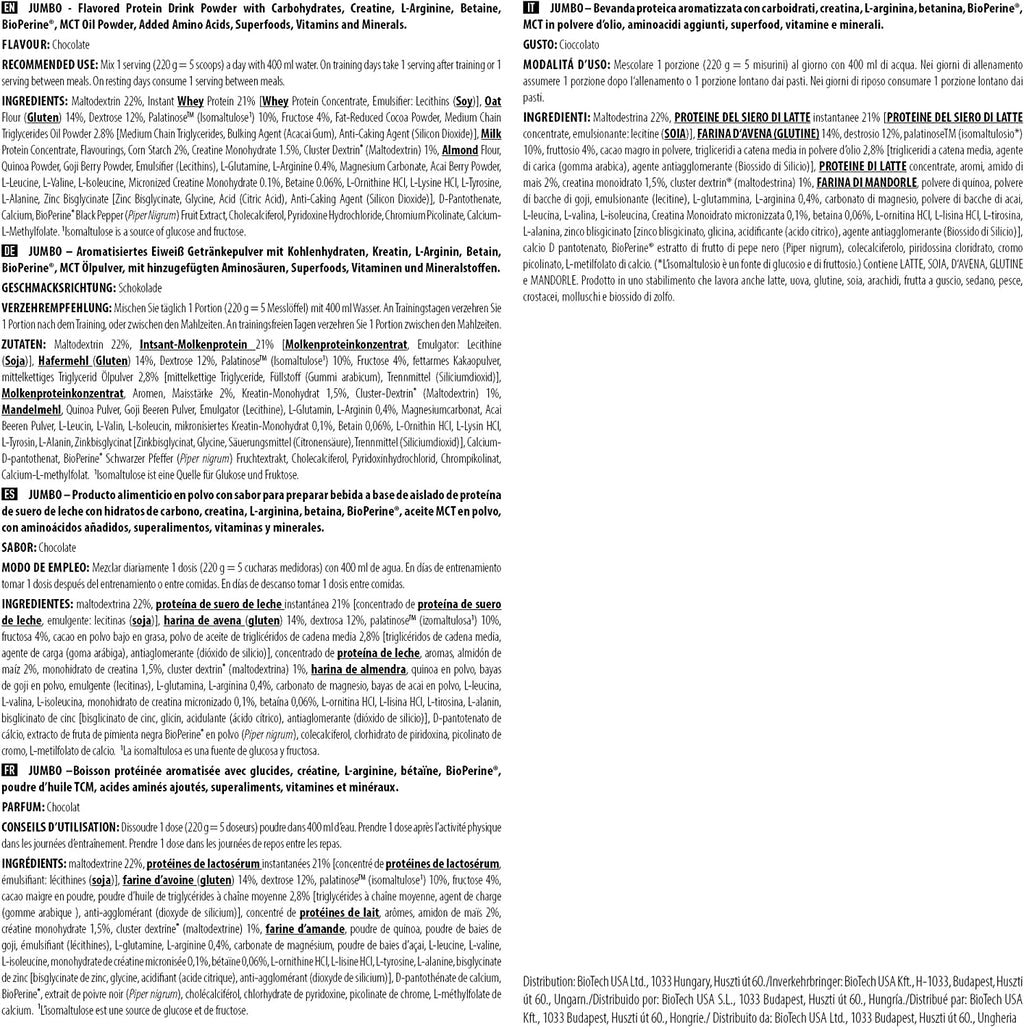 The product also contains 3 grams of creatine per serving, which in this quantity increases physical performance during short, sequential, high-intensity exercise*. The energising complex**, digestive complex***, added amino acids and superfood matrix complete Jumbo's impressive formula.