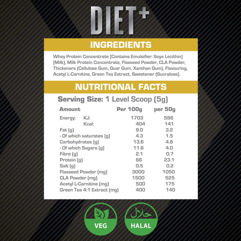 Xcelerate Nutrition Diet Plus is a truly advanced, high protein shake to support weight loss and muscle definition. A high-protein meal with a huge difference; it contains a multitude of potential fat-loss ingredients which may assist with the building of fat-free muscle, without any bulking or excess calorie intake. A Diet that contains a precise Whey Protein Concentrate, Milk Protein Concentrate, Flaxseed Powder, CLA Powder, Acetyl L-Carnitine, Green Tea Extract and more.